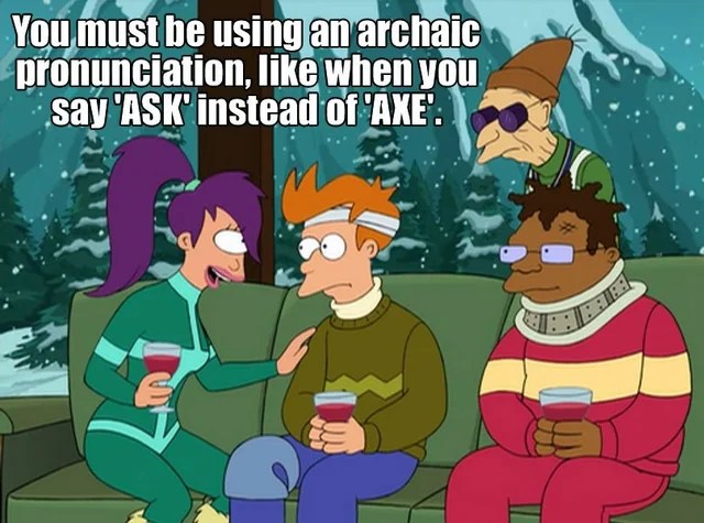 Okay, well I guess we do have to learn a little grammar and such at some point. But, why so rigid? Isn’t part of creativity, taking a foundation and then tweaking it a bit? Don’t get me wrong, I’ve always been a rule follower, but change is part of life. The Futurama writers get it: